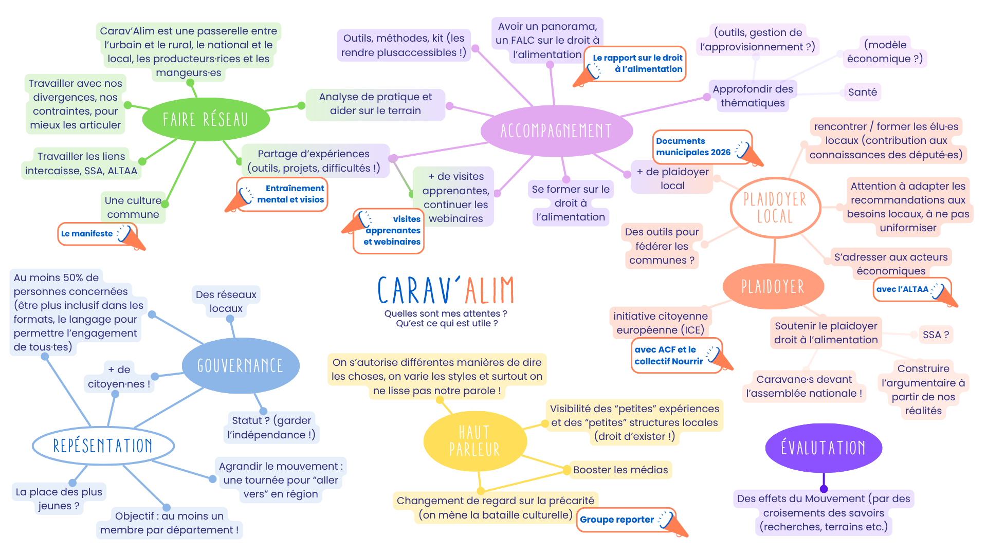 Ce document-bilan servira de support de travail au comité de pilotage pour ajuster notre feuille de route et nos futures actions, renforcer l'existant (les petits haut-parleur indiquent nos actions et ressources déjà en place), et continuer à co-construire ensemble le mouvement !